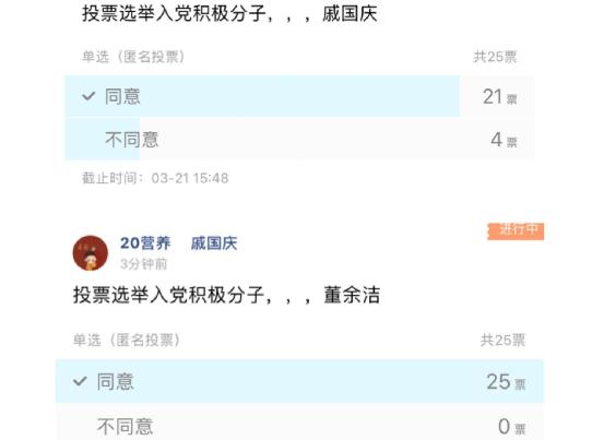 会议伊始,由戚国庆核对实到人数并公布入党积极分子人选,人选分别是戚国庆和董余洁,秉着公平公正的原则,朱佳佳提倡以等额选举的方式进行匿名投票,实到25人,戚国庆和董余洁分别以21和25票通过,本次线上会议圆满完成。(学生编辑:姜余露)