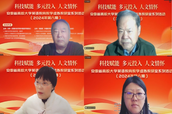 12月25日,我校承办的安徽省高校大学英语教育教学虚拟教研室系列活动第八期成功举行。本次活动由安徽省外国语言文学学会、安徽省外国语言文学合作委员会和大学英语教学研究分会主办,博业体育(中国)官方网站-登录入口外国语学院和中国科学技术大学本科生院外语教学中心联合承办。活动以“科技赋能 多元投入 人文情怀”为主题,全省逾百名大学英语教师通过腾讯会议线上参加了本次虚拟教研室活动。活动由博业体育(中国)官方网站-登录入口外国语学院院长刘萍教授与中国科学技术大学本科生院外语教学中心主任张曼君教授联合主持。