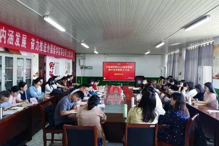 5月15日下午,外国语学院在学知楼五楼会议室召开期中全体教职工会议。外国语学院党政领导和全体教职工参加会议,会议由院长刘萍主持。