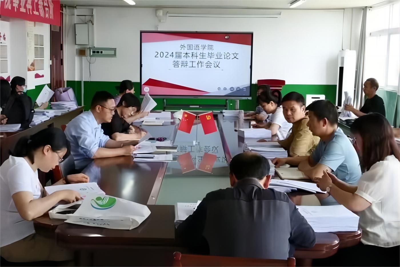 根据《教务处关于做好2024届本科生毕业论文(设计)工作的通知》和《外国语学院2024届本科生毕业论文(设计)工作总体安排计划》等文件要求,为做好2024届本科生论文答辩工作,外国语学院于5月22日下午在学院会议室召开2024届本科生毕业论文答辩工作会议。外国语学院院长刘萍及所有论文指导教师参加会议,会议由副院长洪民主持。