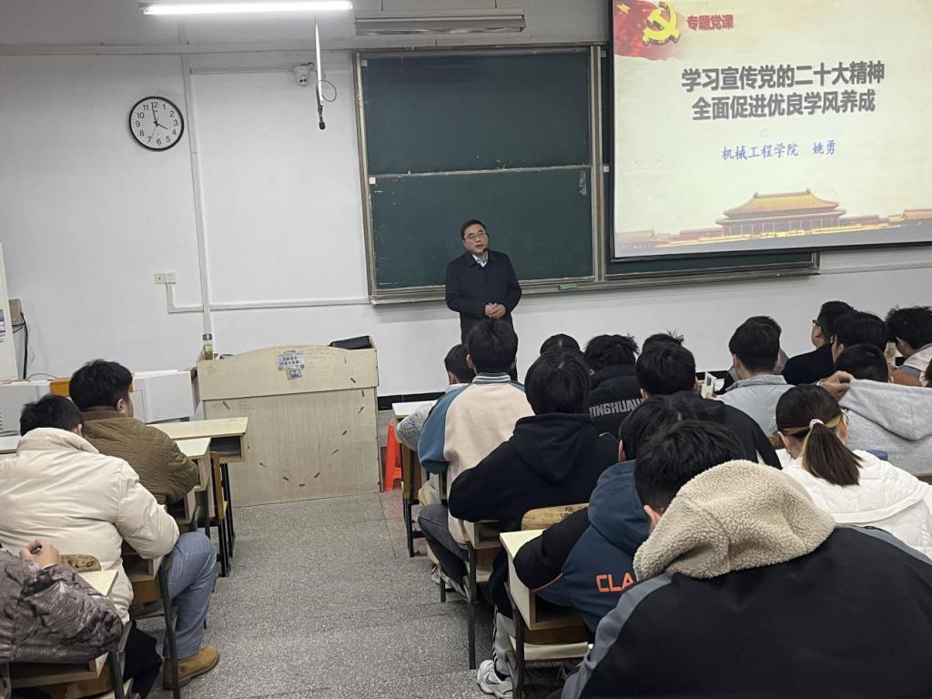 “初心如磐党旗红,奋楫笃行启新程”,为深入学习贯彻党的二十大精神,坚持不懈用习近平新时代中国特色社会主义思想凝心铸魂,提高全体学生党员的政治意识和党性修养。11月15日下午,机械工程学院党委书记姚勇在求A103为学院全体学生党员和发展对象讲授《学习宣传党的二十大精神 全面促进优良学风养成》专题党课。