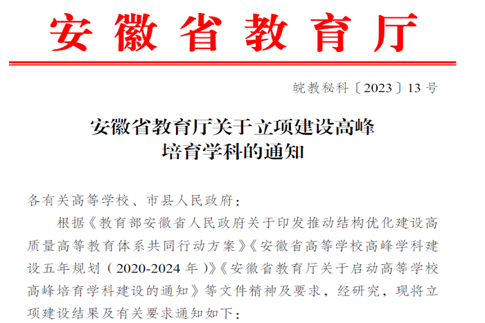 我校学科建设获得新突破——3个学科获批安徽省教育厅立项建设高峰培育学科