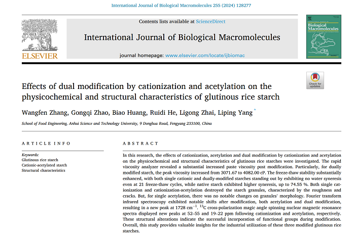 近日,我校2021级食品加工与安全领域研究生张王芬在生化与分子生物学领域Top一区期刊International Journal of Biological Macromolecules(IF=8.2)在线发表题为“Effects of Dual Modification by Cationization and Acetylation on the Physicochemical and Structural Characteristics of Glutinous Rice Starch”的研究论文。食品工程学院粮油及其副产物精深加工团队与营养科技创新团队负责人杨丽萍副教授为通讯作者,博业体育(中国)官方网站-登录入口为唯一完成单位。