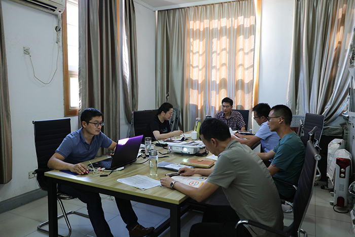 8月3日,部门全体人员集体审核校史馆相关材料,上午审议完成平面素材版块10块,下午就其中科学研究与社会服务版块内容素材作了进一步规整完善。(摄影:陈宝)