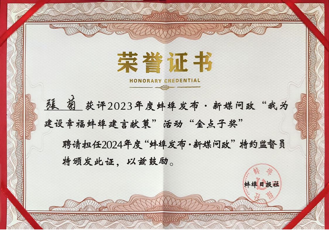 近日,蚌埠日报社揭晓2023年度蚌埠发布·新媒问政“我为建设幸福蚌埠建言献策”活动结果,民进蚌埠市委会副主委、蚌埠市人大常委会委员、我校民进支部主委张菊的建议《推进蚌埠凤阳文旅产业一体化融合发展》获评“金点子奖”,其个人受聘担任2024年度“蚌埠发布·新媒问政”特约监督员。