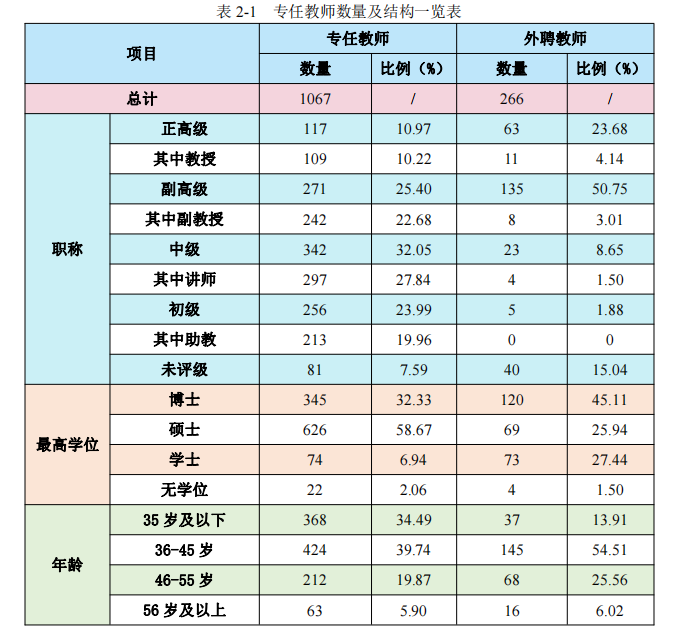 学校现有专任教师1067人,外聘教师266人。专任教师队伍的职称结构和学历结构逐年优化(见表2-1),其中具有教授、副教授等高级职称教师388人,占专任教师的比例为36.36%;具有博士、硕士学位教师971人,占专任教师的比例为91%;“双能型”教师460人,占专任教师的比例为43.11%。国家级、省级优秀教师11人,教育部新世纪优秀人才2人,省学术和技术带头人及后备人选6人,享受国务院及省政府特殊津贴专家9人。柔性引进省级领军人才团队 3个。国家级教学团队1个,省级教学团队19个,省级科研创新团队15个,省级教学名师29人,省级教坛新秀48人。