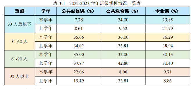 本学年,全校开设本科生公共必修课、公共选修课、专业课共计1852门、5695门次。学校各专业平均开设课程27.71门,其中公共课4.05门,专业课23.66- 12 -- 13 -门;各专业平均总学时2187.57,其中理论教学与实验教学学时分别为1722.59、387.38。全校各专业学时、学分具体情况详见附表3。学校着力推进专业课程小班化教学模式,近两学年班级规模情况见表3-1。