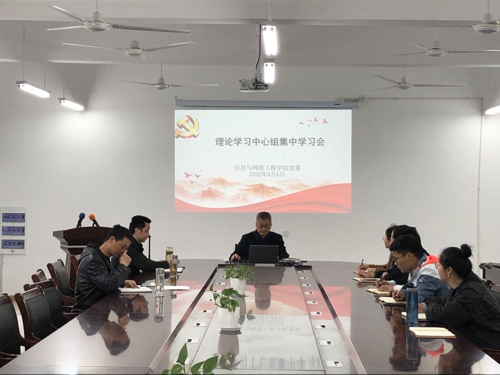 4月6日上午,信息与网络工程学院党委在尚行楼B418会议室召开理论学习中心组(扩大)学习会议。学院中心组成员、各党支部书记、党支部委员参加了会议,会议由院党委书记王振其主持。