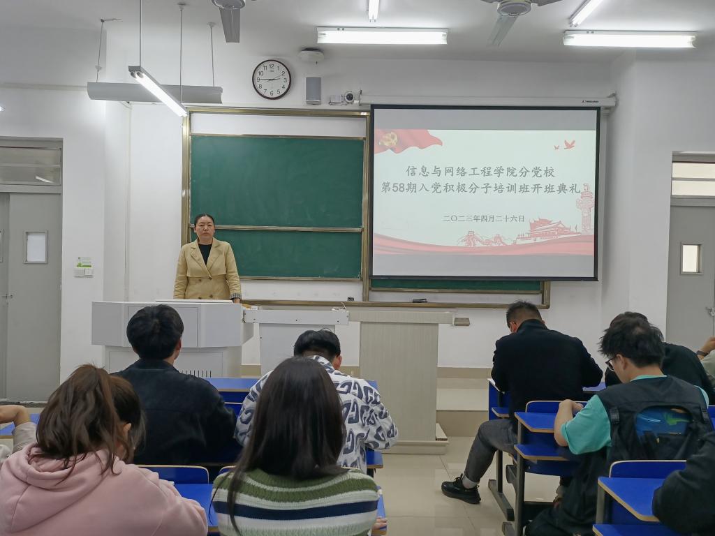 为加强入党积极分子教育培养工作,提高党员发展质量,4月26日下午,信息与网络工程学院在尚行楼C204举办第58期入党积极分子培训班开班典礼。学院党委副书记、纪委书记韦乃学、专职辅导员李军成、专职辅导员崔北坤、专职辅导员许磊出席会议,培训班109名学员参加会议,会议由专职辅导员陈凯主持。