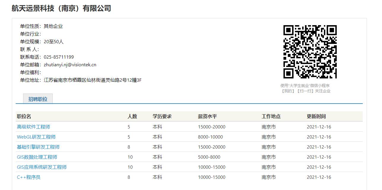 武汉航天远景科技股份有限公司成立于2004年,是一家专注于空间地理信息产品研发与时空大数据增值服务的高新技术企业,总部位于中国武汉东湖新技术开发区,先后在北京、深圳成立分公司,在日本、墨西哥、哥伦比亚、马来西亚和台湾地区设有代理机构。航天远景科技(南京)有限公司是由江苏省地理信息产业研究院和虚拟地理环境教育部重点实验室共同孵化,由高校知名教授和行业资深专家共同创立的高科技企业。 公司拥有自主知识产权的三维虚拟地理环境平台软件,为多个政府部门和企业提供专业的三维地理信息系统、虚拟仿真等方面的技术服务。在此平台上,围绕智慧城市建设、三维仿真、虚拟现实(VR)与混合现实(MR)等应用业务,已经形成了超大场景三维地理环境仿真系统、全球二三维一体化数据发布系统、二三维一体化房产管理系统、自然资源综合管理基础数据平台系统、物联网仿真系统等多个应用系统,形成了独具特色的三维空间信息的行业应用。
