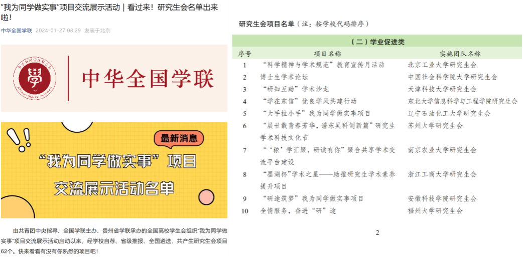 近日,全国学联发布了2023年度全国高校学生会组织“我为同学做实事”优秀项目交流展示名单,我校研究生会《“研途筑梦”我为同学做实事项目》成功入选。本次活动由共青团中央指导,全国学联主办,贵州省学联承办,自启动以来,经学校自荐、省级推报、全国遴选,最终共有62个研究生会项目入选全国学生会组织“我为同学做实事”优秀项目交流展示活动。