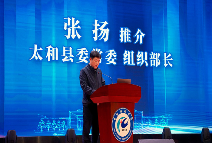 时伟在致辞中,对来校招贤纳才的太和县领导和企业家朋友表示热烈欢迎,并简要介绍了学校的办学历史和发展成就,他指出,太和县历史悠久,人文荟萃,首位产业与我校学科专业契合度非常高。学校与太和县的校地、校企沟通联系不断加强,交流合作持续深化,取得了显著的合作成果,特别是学校在太和县设立科技成果转化分中心,助力乡村振兴战略,推动绿色食品产业全产业链高质量发展。他希望,我校毕业生找准定位,珍惜良机,留在安徽就业奋斗,用青春书写无愧于时代的华彩篇章。