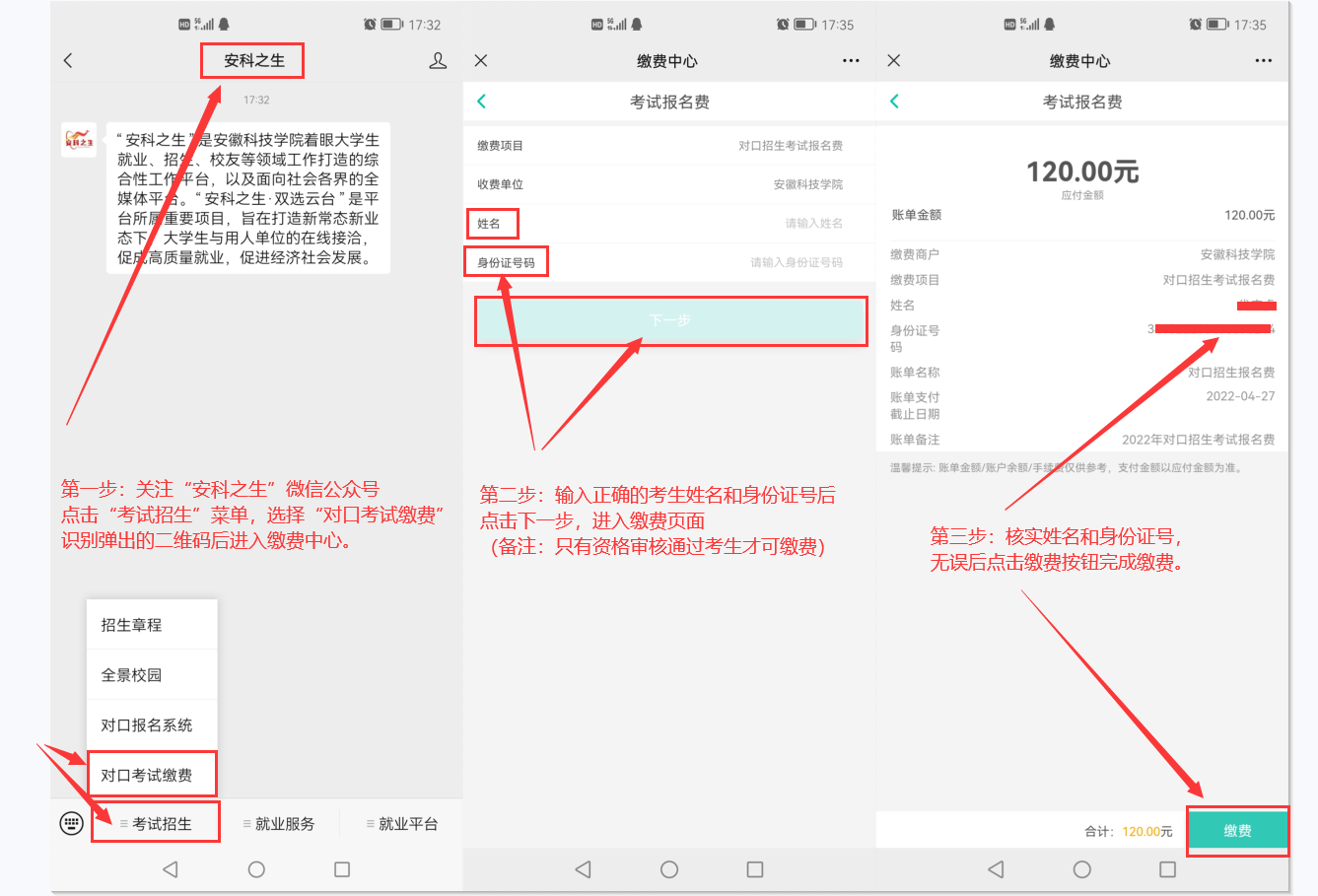 根据《博业体育(中国)官方网站-登录入口2022年面向中职毕业生对口招生章程》规定,报考我校的考生,资格审核通过后,需缴纳考试报名费120元。请广大考生扫描下方二维码关注博业体育(中国)官方网站-登录入口招生办公室官方微信公众号“安科之生”,我校对口招生缴费、成绩查询、划定录取分数线都将通过此公众号同步发布。缴费截止时间4月27日。