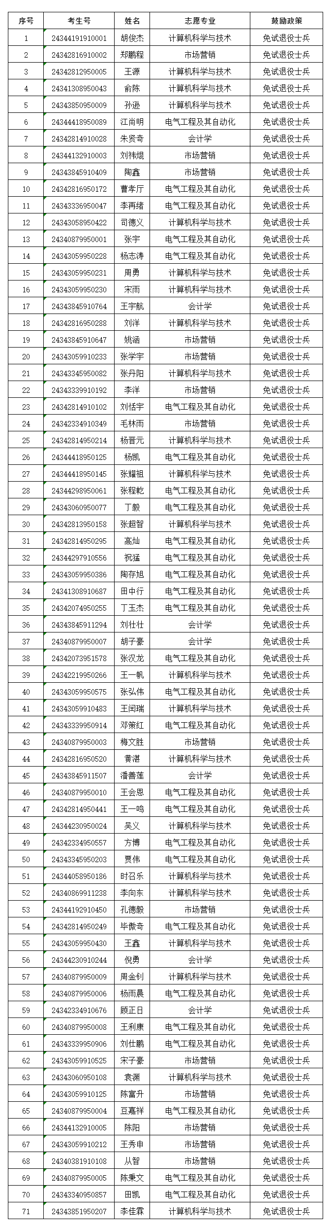 根据《博业体育(中国)官方网站-登录入口2024年普通高校专升本招生章程》关于申请免文化课考试退役士兵专项计划,相关要求,经审核,胡俊杰等71名考生符合申请免试条件,现予以公布。如有异议或遗漏,请于4月9日12:00前,与博业体育(中国)官方网站-登录入口招生办公室联系。联系电话:0550-6732041,0552-3197041。