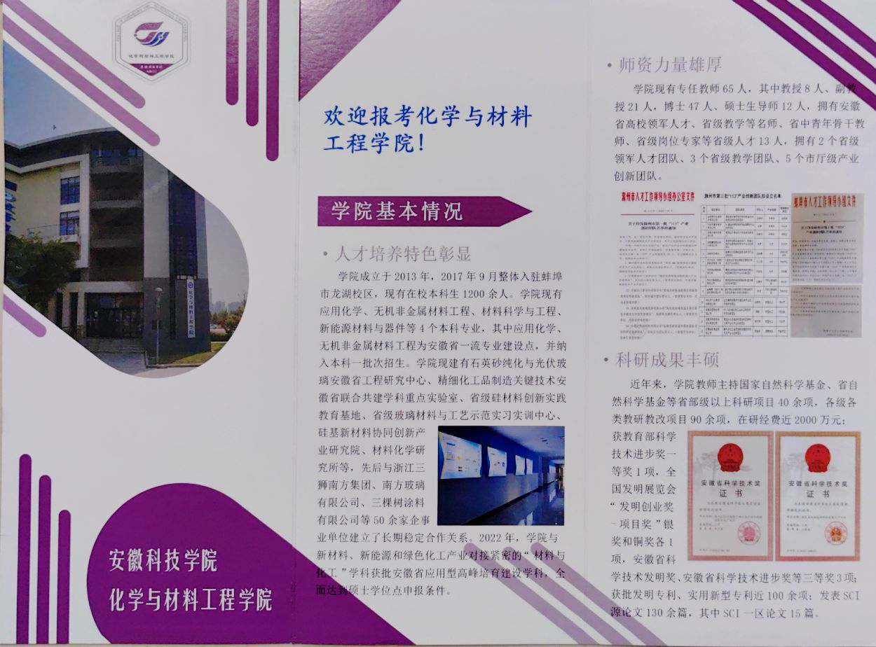 为积极应对新旧高考志愿填报模式转变可能带来的生源质量变化挑战,化学与材料工程学院在高质量完成学校下达的招生宣传任务基础上,学院还制作了“欢迎报考博业体育(中国)官方网站-登录入口化学与材料工程学院”H5易企秀,组织师生利用微信群、QQ群宣传;学院印制了“欢迎报考化学与材料工程学院”纸质宣传册子,随同学校的宣传材料一并发放,主动向有化学及材料类报考意愿的考生及家长介绍学院,吸引考生关注学院。