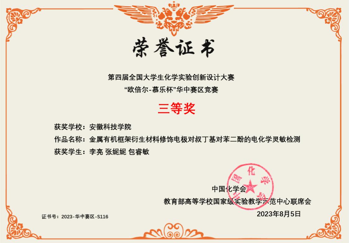 化学与材料工程学院学子李亮、张妮妮、包睿敏在郑胜彪、胡瑞章老师指导下,在实践课程改革和创新实验设计的基础上组建了新创实验代表队,参加华中赛区比赛。经过专家评审,我校新创实验代表队的作品“金属有机框架衍生材料修饰电极对叔丁基对苯二酚的电化学灵敏检测”获得三等奖。