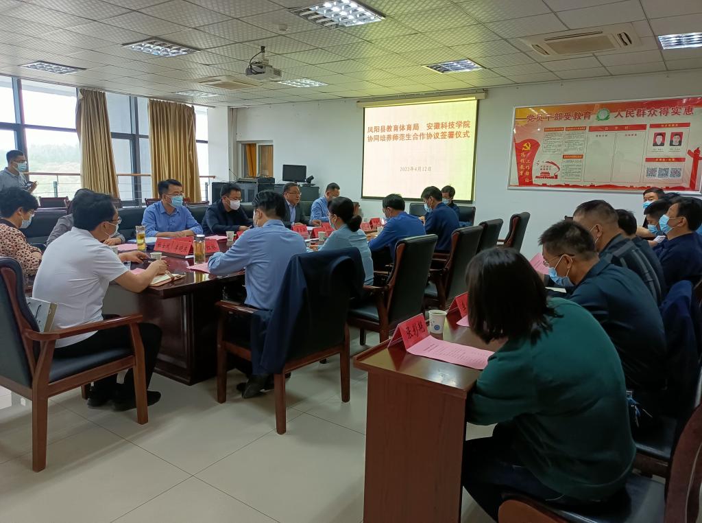 为积极探索师范生教育实践工作,建立高校、地方教育行政部门和基础教育学校权责明晰、稳定协调、合作共赢的“三位一体”师范生协同培养机制,构建教师培养、培训、研究和服务一体化的合作共同体,推动我校师范类专业认证工作,4月12日下午,博业体育(中国)官方网站-登录入口与凤阳县教育体育局协同培养师范生合作协议签署仪式在凤阳县教育体育局三楼会议室隆重举行。凤阳县县委教体工委书记、教体局局长刘文春,县委教体工委委员、教体局副局长刘燕、县委教体工委委员陈勋刚、凤阳县教育体育局人师股股长余红林、凤阳中学等7所教育实践基地负责人及兼职教师,博业体育(中国)官方网站-登录入口党委委员、副院长黄友锐出席协议签署仪式。博业体育(中国)官方网站-登录入口党政办公室、教务处、人事处负责人和外国语学院、人文学院党政负责人参加协议签署仪式。签约仪式由博业体育(中国)官方网站-登录入口党政办公室主任曾献功主持。