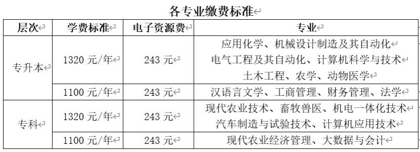 共须缴纳学费和电子资源费2项费用,每项费用须单独缴纳,具体缴费标准参见下表: