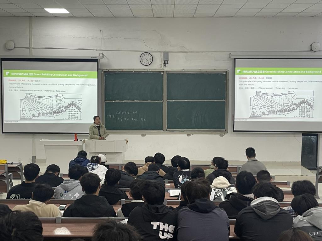 王薇教授从绿色建筑内涵与发展趋势、适宜性绿色建筑实践技术、绿色建筑助力双碳目标实现及人工智能赋能绿色建筑技术等四个方面,阐述了绿色建筑的发展历程和未来趋势。通过对国家战略的精确解读,在生态文明建设的大背景下,强调了“双碳”目标对我国绿色低碳发展的引领性作用,以及对环境质量改善和产业发展的巨大推动效应。王教授通过深入浅出的例举展示了绿色建筑技术对推动经济结构绿色转型,进而促进环境保护、经济社会协调和可持续发展所发挥的作用,让师生更加直观地认识绿色建筑及其特点。在互动环节中,就未来建筑发展和使用情况进行了探讨,并有针对性地解答了师生们有关学科发展、专业建设和职业规划等方面的疑惑。