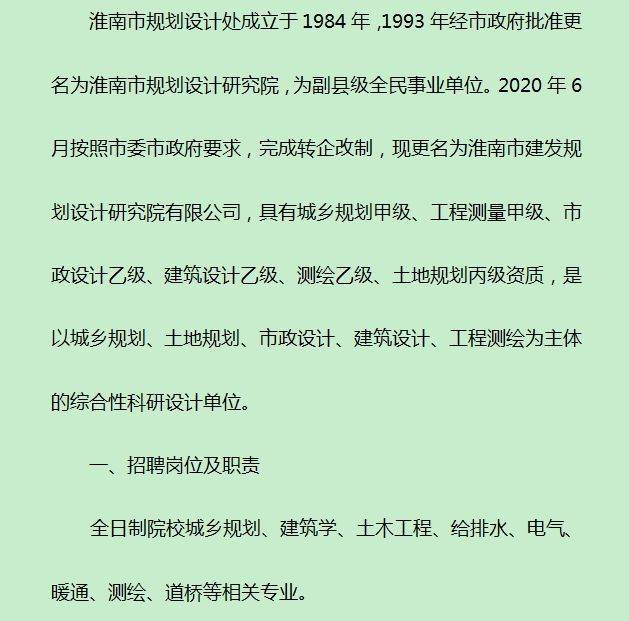 淮南市规划设计处成立于1984年,1993年经市政府批准更名为淮南市规划设计研究院,为副县级全民事业单位。2020年6月按照市委市政府要求,完成转企改制,更名为淮南市建发规划设计研究院有限公司,现招聘全日制院校城乡规划、建筑学、土木工程等相关专业2022届应届毕业生。此次线上沟通交流为学院毕业生拓展了若干个就业岗位。(特约通讯员:吴婷婷 审核:傅友福)