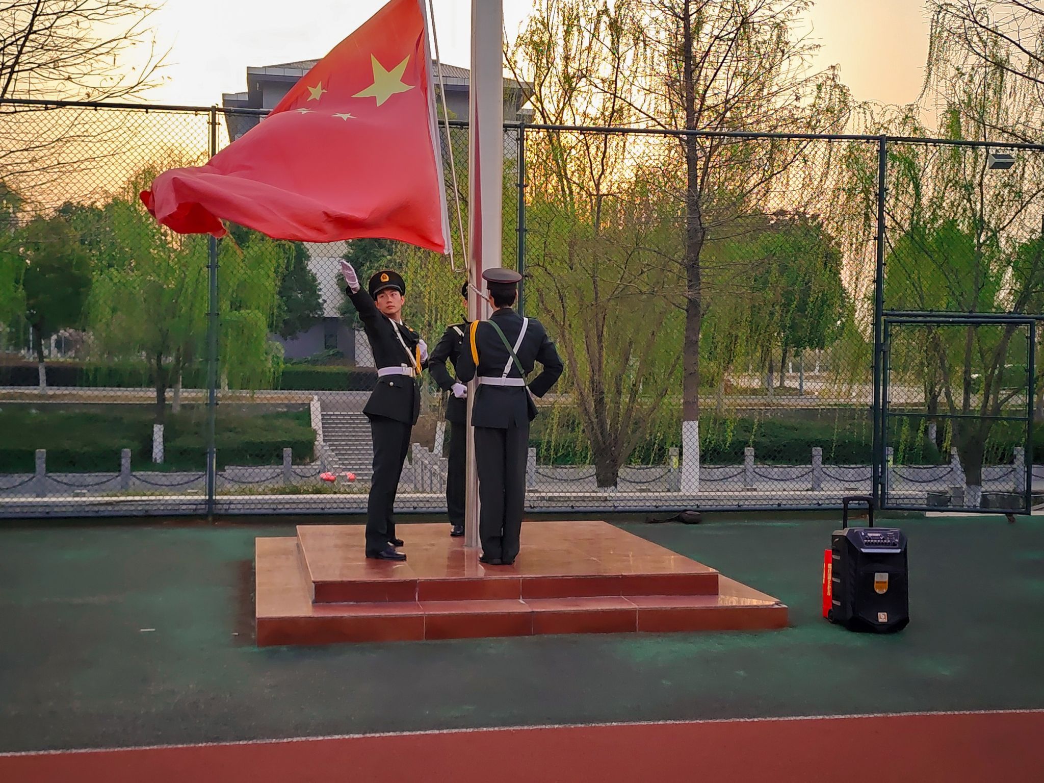 仪式伊始,国旗护卫队队员迈着整齐有力的步伐护送国旗入场。随着激昂的《义勇军进行曲》奏响,全体同学整齐列队,目光坚定地注视着国旗,齐声高唱国歌,鲜艳的五星红旗在雄壮的国歌声中缓缓升起,迎风飘扬。在场的每一位师生都向国旗行注目礼,饱含着对祖国深深的热爱与崇高敬意。