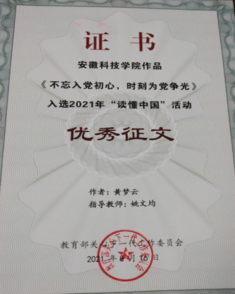 日前,在教育部关工委开展的 “读懂中国”活动中,博业体育(中国)官方网站-登录入口关工委获2021年“读懂中国”活动优秀组织奖,选送的征文《不忘入党初心,时刻为党争光》获优秀征文奖。