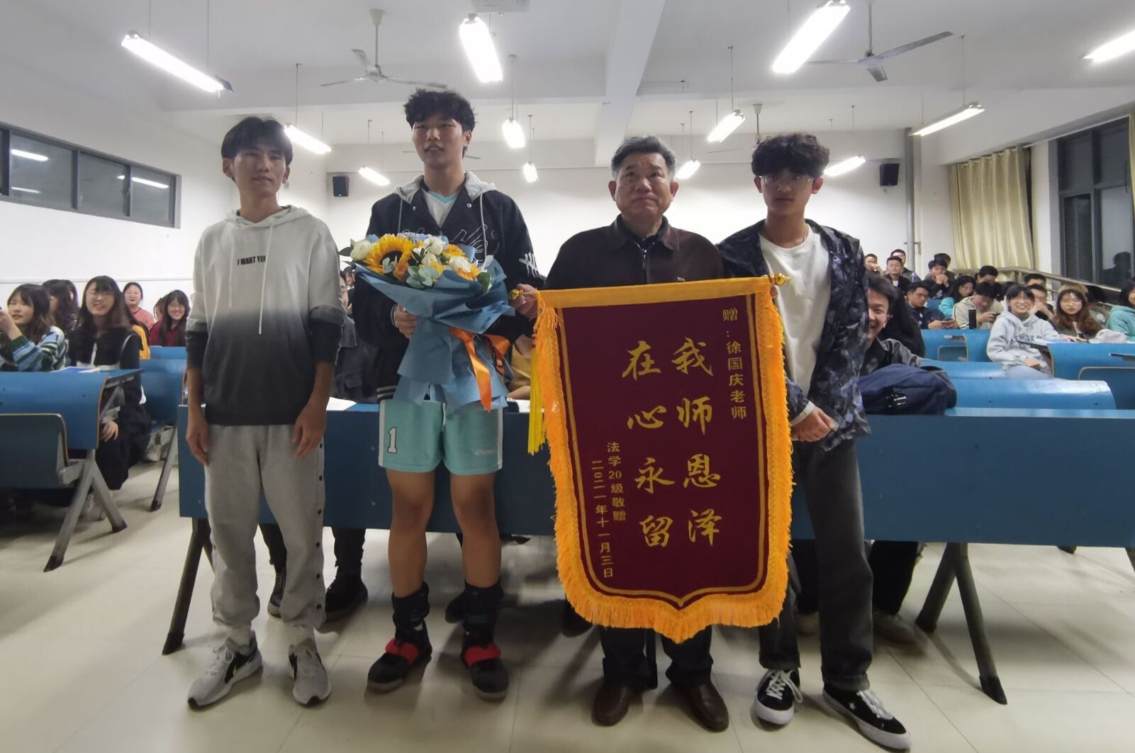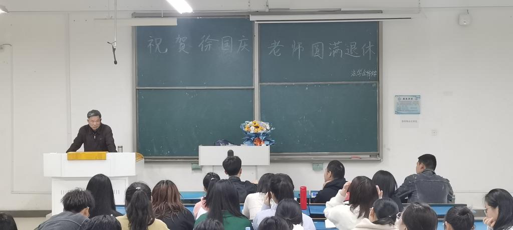 退休前的最后一堂课,法学专业的学生们为徐国庆老师送上了锦旗、鲜花与贺卡。贺卡上写着:难忘师恩。(特约通讯员:焦雪松 审核:李沙娜)