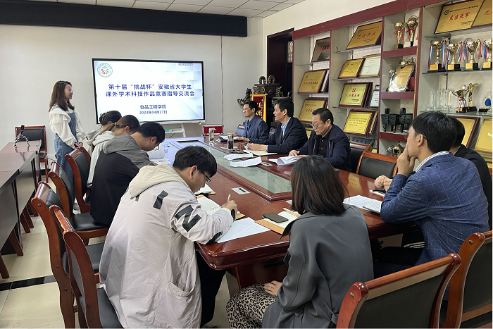 为进一步打磨提高学生学术科技作品质量,打造精品项目,4月27日上午,食品工程学院开展第十届“挑战杯”安徽省大学生课外学术科技作品竞赛指导交流会,为入选省级项目的两支队伍提供详细指导。学院党委书记付光玺,院长杜传来,党委副书记、纪委书记王广良出席交流会并指导,相关指导老师和团队成员参会。
