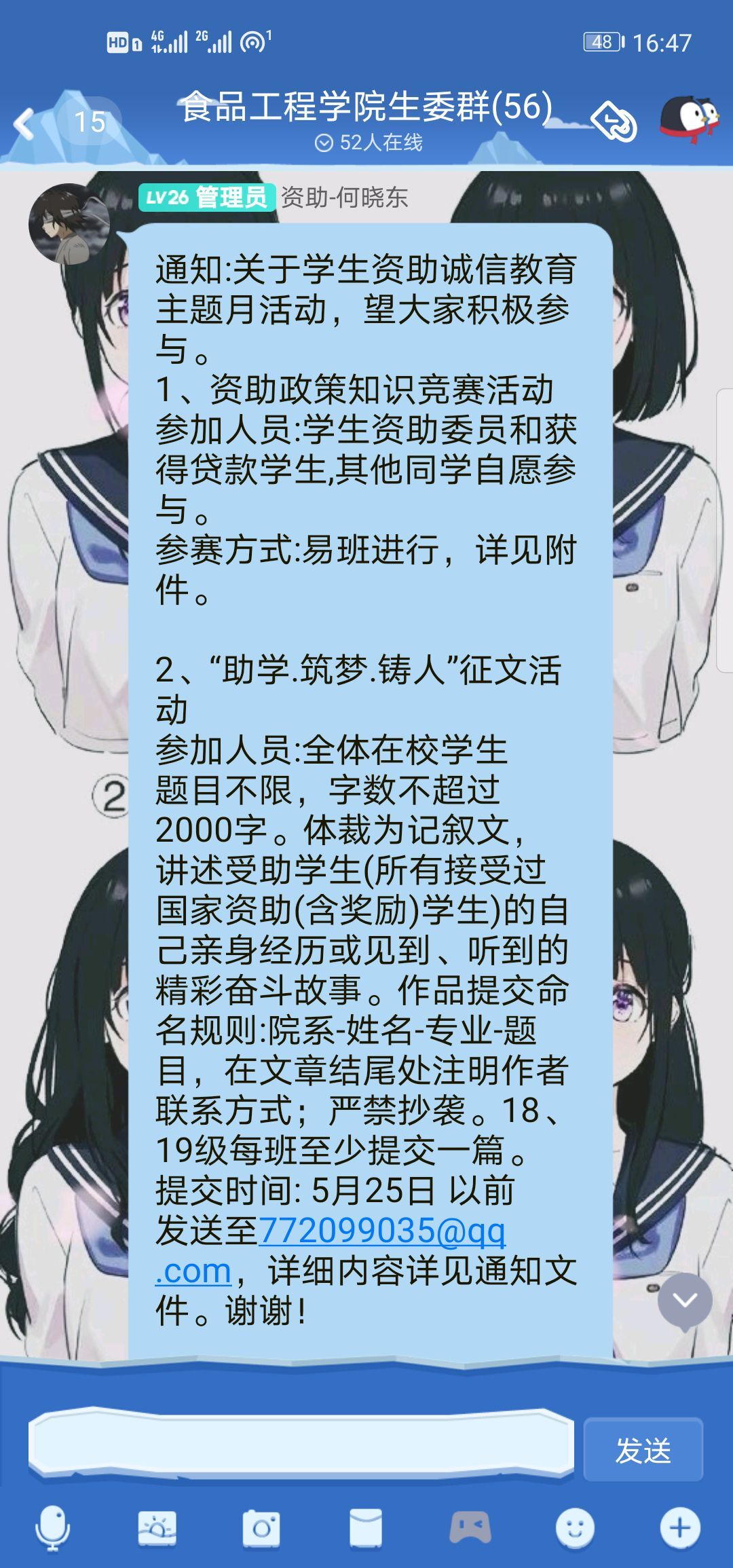为了让学生深入了解国家及学校的资助政策,感受党和国家的关怀和温暖,营造食品工程学院学子诚实守信、拼搏进取的良好氛围。5月27日下午,食品工程学院学生会开展学生资助诚信教育线上活动!此次活动由两部分组成:资助政策知识竞赛活动、“助学.筑梦.铸人”征文活动。