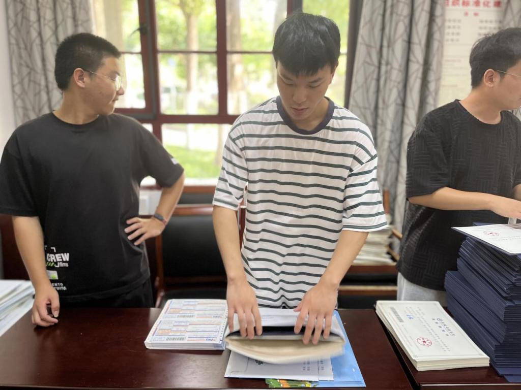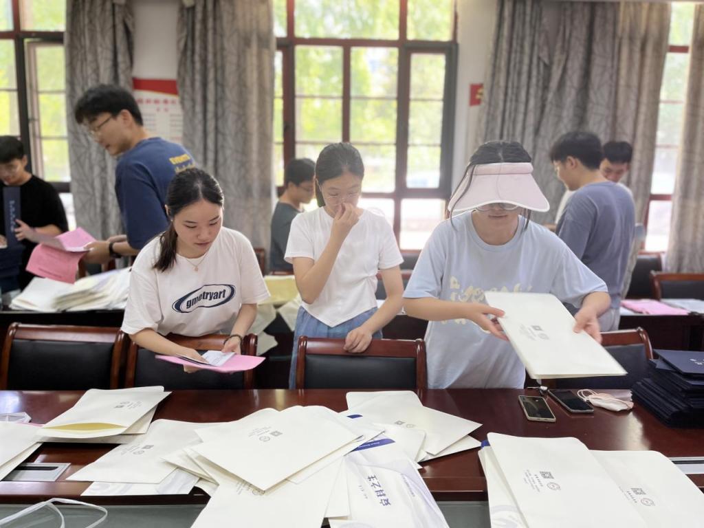 封装现场,付光玺调录取通知书的封装非常关键,要保证每一份录取通知书都能够、安全、精准地投递到新生手上,要求学生干部们认真装配好每一份录取通知书,仔细核对学生信息,保证录取通知书寄发工作的顺利开展。