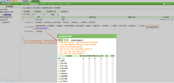 三.添加管理员后,根据实际需求对当前管理员进行权限分配,将所需的权限前面打勾,保存即分配权限完成。(备注:资料库栏目权限必须选择,否则管理员将无法管理任何栏目)