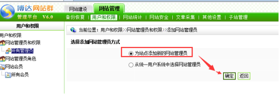 二.添加管理员-选择为站点添加新的网站管理员-输入用户名、密码等信息,点击确定