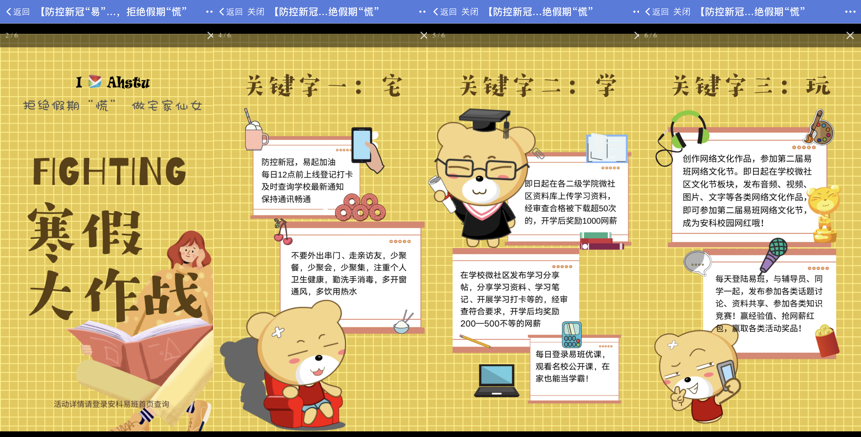 开展形式多样的网络思政教育。开展线上学习。发起“抗疫加油,寒假大作战”活动,倡导抗疫宅家,学玩并重,收集推送中外文献线上数据库开放集合,考研学习,常用软件学习课程等资料,同学们宅家学习云记录,学校微社区发帖话题记笔记交流心得。利用易班优课功能开展防治新冠病毒知识竞答,防控知识常推送,掌握多少考一考,以不同形式督促同学们新冠肺炎的防治常识要入眼更要入脑,并在日常生活中落实到位。