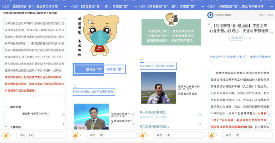 发挥网文及新媒体产品思政功能。制作《你农我农,祈福华农》《白衣战士》等原创帖讲述安科人在这场抗击疫情大战里的暖心故事和美好祝愿。发动辅导员利用挥易班博文功能,围绕爱国主义教育、生命教育、社会责任感教育、规则教育、爱与感恩教育等积极撰写网文。制作《抗击肺炎武汉加油、湖北加油》《辅导员喊你停课不停学》等短视频,积极宣传好新时代青年众志成城、扶危济困、无惧无畏、乐观向上的精神。