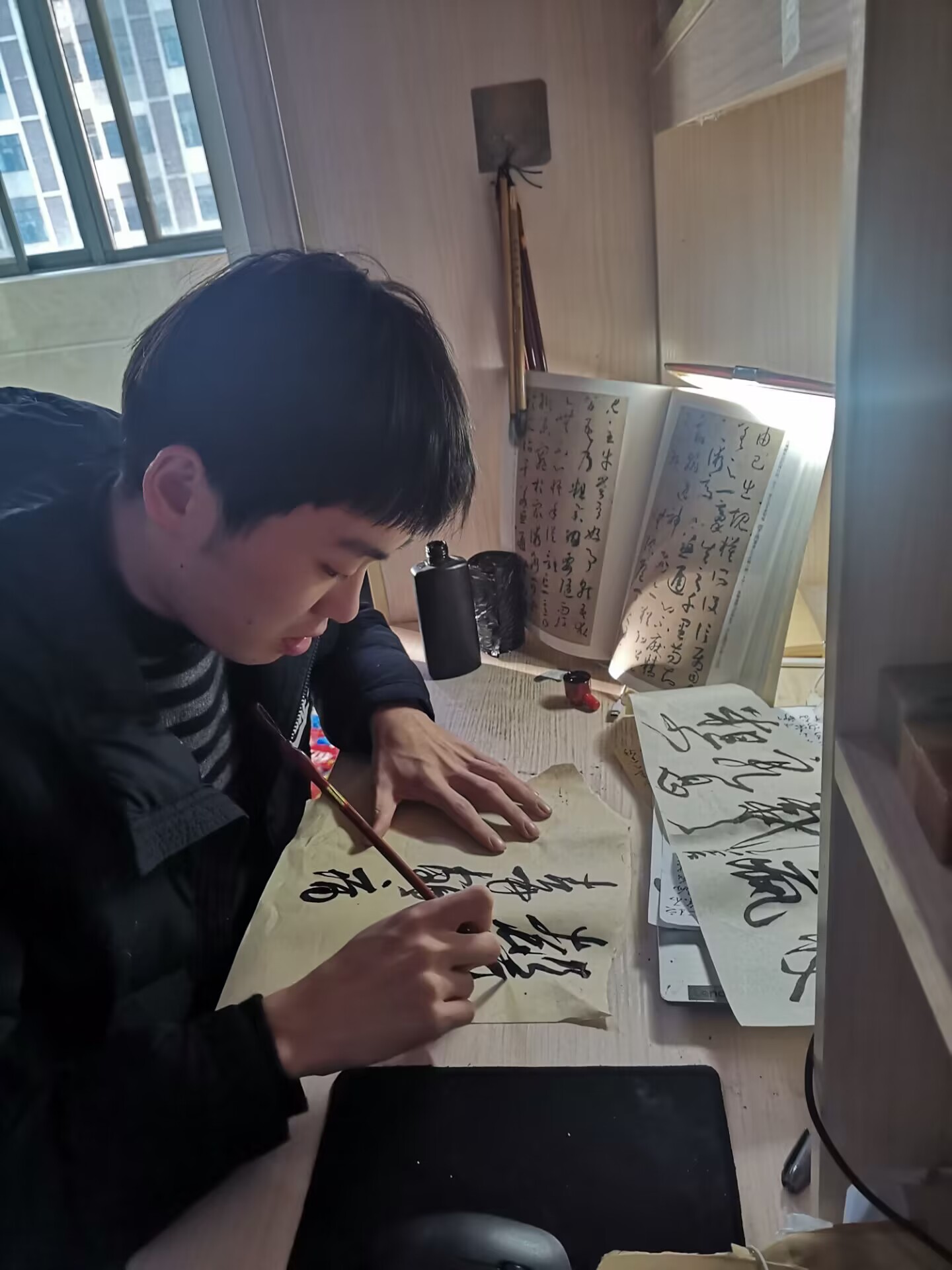 陶乐乐对学习充满热情,善于钻研,乐于将所学的知识融会贯通并总结出一套自己的学习体系来丰富自己的学识境界。他具有丰富的想象力和创造力,在团队设计专利“数字化供水业务服务平台”的过程中,他提出了用“高斯曲线模型”和“数学方位视角”来解决其中一项有关客户体验感提升方法的问题。他曾以个人名义参加了“第二届安徽省大学生品牌创意设计大赛”A类赛事,并取得了省一等奖。他还十分痴迷于书法艺术,尤爱晋唐时期的潇洒书风。在任职“博业体育(中国)官方网站-登录入口书美协会副会长”期间,他举办了书法知识竞赛、书法创作分享大会、书法艺术展等多项活动,除此之外,他还计划申请加入中国书法协会。