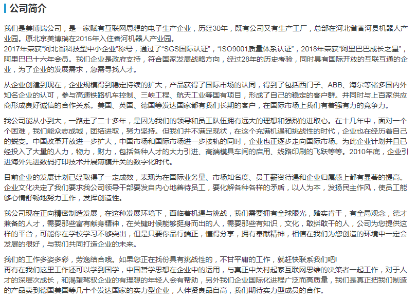美博瑞(香河)电子信息科技有限公司招聘信息
