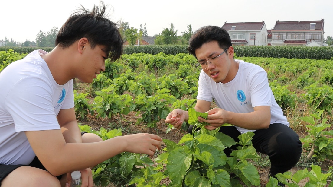 种桑养蚕密不可分,解决了养蚕问题,实践团成员又与当地养蚕大户一同走进桑园,实地考察当地的桑田种植规模以及桑树生长状况,实践团成员发现桑园的管理存在漏洞,新生的桑地杂草丛生,桑叶还没有长成就被杂草夺走了土壤中的水分和养料,导致当地桑叶产量下降。团队成员颜承海说:“根据杂草发生的规律进行除草,夏除应当进行2-3次最佳。”实践团成员结合所学与蚕农就桑树种植、病虫害防治、饲喂方法等方面进行了深入的探讨和交流。在交流过程中,实践团成员还对蚕农提出的生产实际问题提供了技术指导并赠送技术手册供蚕农学习。
