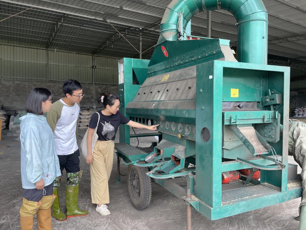 随后,老师和志愿者们来到家庭农场内,全面跟踪了稻米烘干、加工与利用等情况,包括水稻、小麦品种选择、播种机类型、灌溉设备情况、收割机、烘干机等大型机械设备的使用情况。发现了农场生产面临的肥料利用效率不高、栽培技术单一等科学问题,研究生们深刻认识了自身科研方向的使命担当。志愿服务队参观后就当前基地种植及收益情况与农场主进行了研讨交流,对水稻的种植方法、生长习性、发展前景以及存在的问题等方面进行了深入探讨。农场主李勇表示,通过施用志愿服务队开发的有机无机混施专用肥,肥料成本降低了20%,稻麦两熟田的水稻、小麦抗病能力明显提高,产量显著提高。但李勇一是担心有机无机混施专用肥会对土地产生不利的影响,导致土壤肥力不够影响水稻后期生长;二是水稻季秸秆直接还田效果不好,就如何更高效处理作物秸秆等问题咨询志愿者服务队,希望给予解决。