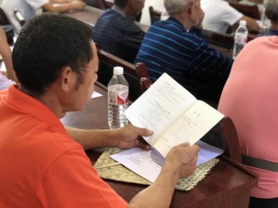 农户在会上阅读一号文件 成员发放并讲解《达川乌梅栽培技术规程》手册