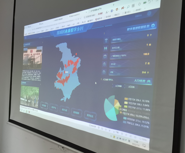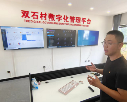 实践初期,双石村委书记赵林带领志愿服务团师生参访党群活动中心,随后与团队师生展开座谈交流。双石村赵林书记表示,双石村从2021年初开始打造数字化乡村,建起“魔镜”安防治理系统、村务管理系统,以及5G+智能物联网体系。下一步,还将加快数字化布局,发展智慧渔业、智慧种养殖业,用智慧赋能产业。在赵林书记的带领下,团队成员先后参观了双石村的现代为农服务站和双石村数字控制中心,了解了数字乡村、数字村务运行系统的原理和规则。