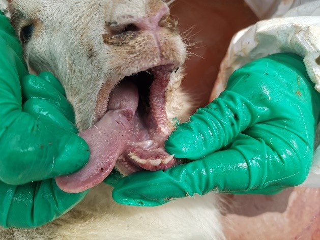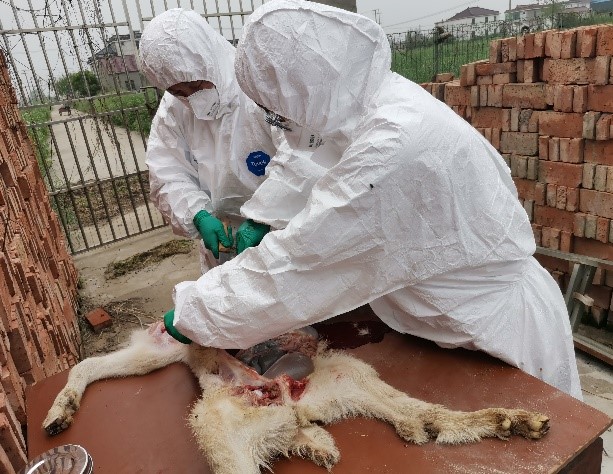 “山羊宝宝生病,兽医药到病除”。科技服务团前期接到山羊养殖畜主咨询描述:养殖基地部分山羊出现呼吸短促,口角及口腔发生溃疡、糜烂、腹式呼吸等症状。博士团成员根据描述,现场剖检病死山羊发现肺组织水肿、心包膜有组织液渗出、呼吸道黏膜出血和水肿、脾脏肿大等病理变化。同时采集病理症状明显的组织,带回实验室进一步病原学检测,为后续临床给药提供更加准确的诊断和指导。