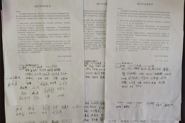 11月至12月,根据期末考试安排,各班级积极召开“诚信考试”主题班会,严肃考风考纪,班会由辅导员或班长主持。各班级围绕期末考试、考试纪律以及学风建设的重要性,以交流讨论、代表发言、集体宣誓等形式开展考风考纪宣传教育活动,要求班级学生干部带头,班长、团支书组织晚自习,学习委员负责考勤,及时做好复习资料的总结、转发,寝室长督促寝室成员复习,组建学习兴趣小组,一对一开展学习帮扶,以饱满的状态迎接期末考试。
