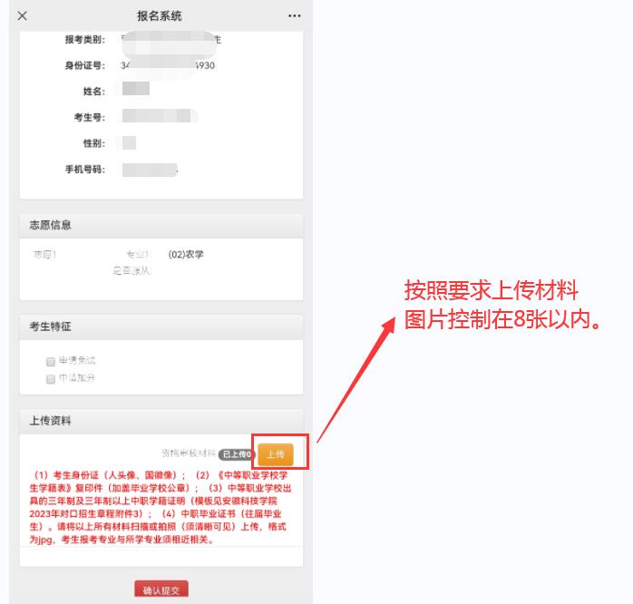 第五步:选择“上传材料”板块,按照要求,上传资格审核材料,审核无误后,点击确认提交按钮,一旦提交,不可更改。
