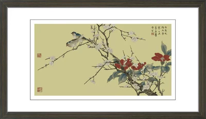 该云锦画名为啼鸟寒枝,画芯:63x33cm外径:95x55x5cm,系著名美术教育家、画家陈之佛的写意花鸟。画以梅花、山茶、小鸟三者为主体,清新隽逸,典丽华滋寓意母校七十年办学,艰苦奋斗、砥砺奋进,不惧寒风不畏冬雪预示母校事业发展蒸蒸日上,一代代安科人以昂扬奋进的姿态开拓未来。