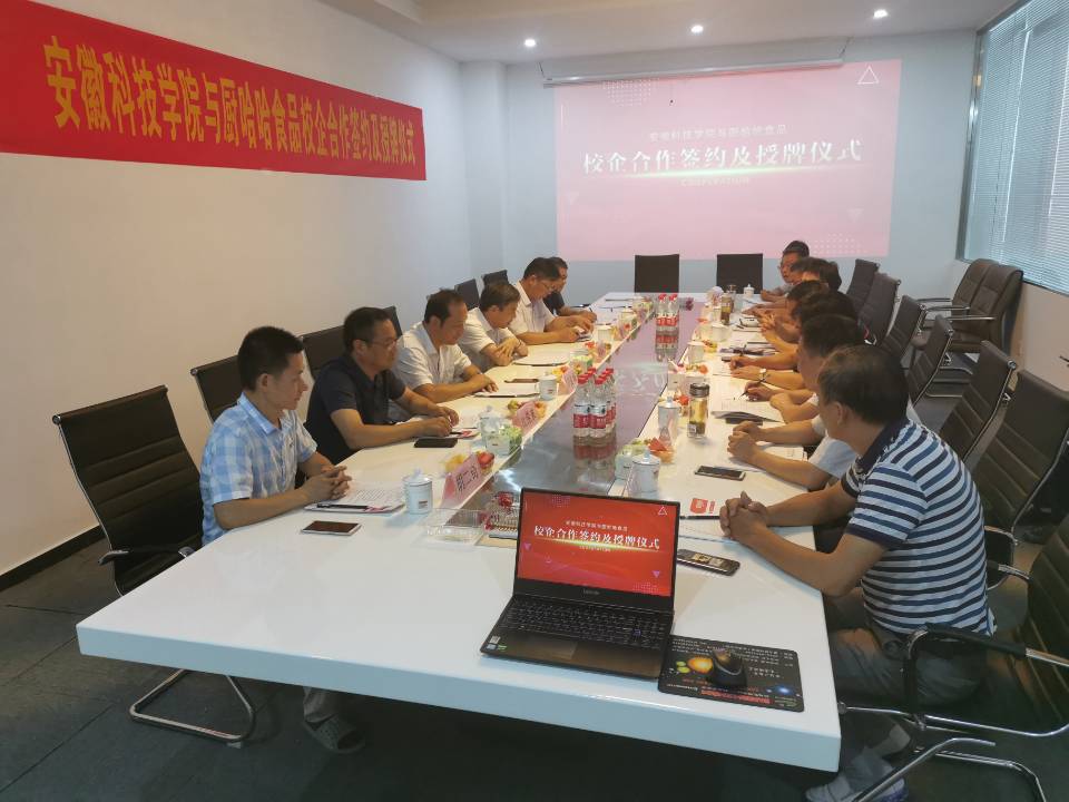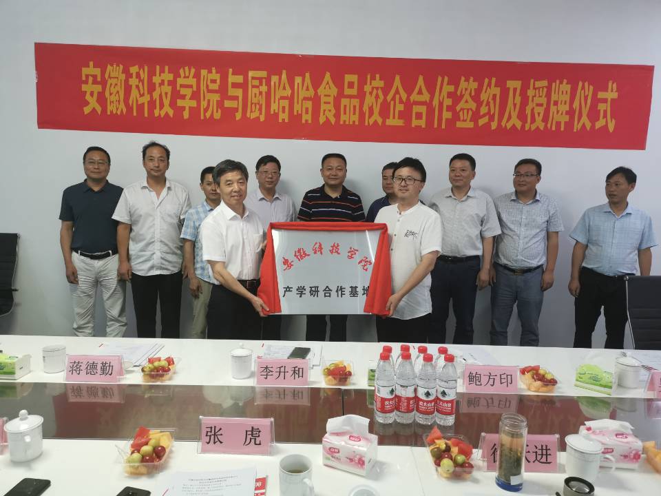 8月19日下午,我校与安徽厨哈哈食品科技有限公司校企合作签约及授牌仪式在潜山市举行。校党委书记蒋德勤,党委委员、副校长李升和,潜山市人民政府副市长徐郑生出席仪式。食品工程学院院长李先保、副院长杜传来,科研处副处长鲍方印,食品工程中心主任吴晓伟,潜山市政府办、市监局、招商局、王河镇负责同志,安徽厨哈哈食品科技有限公司董事长张虎、总经理胡二奇等一同出席仪式,仪式由李先保主持。